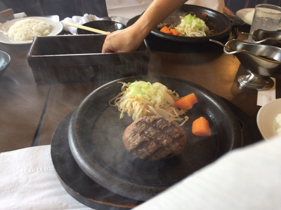 熱々の鉄板に乗ってハンバーグの登場~